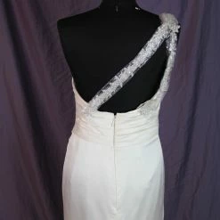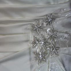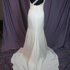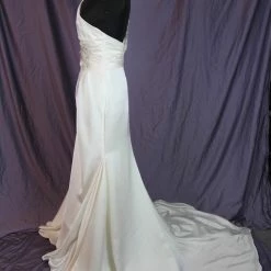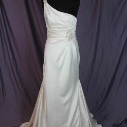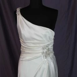 This Pronovias Wedding dress is a one shoulder morbido satin a-line gown with silver beads.