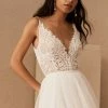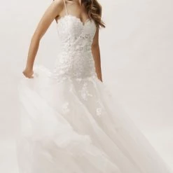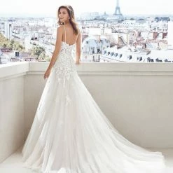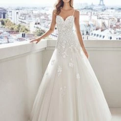 This drop waist ballgown features a semi-sheer embroidered bodice topping a full tulle skirt. Special details like beaded straps and a row of covered buttons complete the regal look. By Luna Novias.