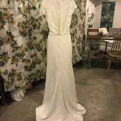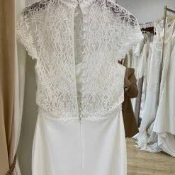 This gown features a gorgeous sheath shape and fabulous lace and crepe material. High neckline and short sleeve compliment each other. SO flattering. This gown is a lightly tried on and has never been worn outside the salon.