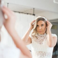 Beautiful high neck neck lace wedding gown. This gown has delicate late on the bodice with a simple crepe bottom. The dress has lovely small buttons up the back for a simple closure. There is a built in bandeaux style bra with cut outs below to accentuate lace details.