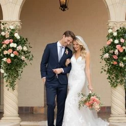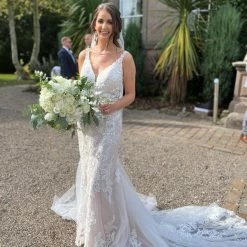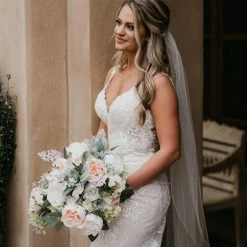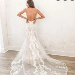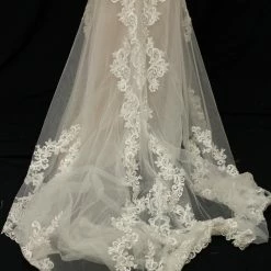 This gown is by bridal designer Stella York. The style is 7100. It is designed in Lace and tulle. The color is Ivory/Moscato in a size 10. The original retail price of this gown was $1,799.
