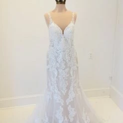 DESCRIPTION: This is a current Stella York style. Taking traditional bridal beauty into the modern age, this stunner from Stella York is bringing classic back—literally. An elegant V-neckline starts off this ultra-feminine silhouette, complete with sheer lace straps and a beaded floating strap detail in the back for a totally modern twist. The use of negative space throughout the gown really adds to the dimension and figure-flattering element of this gown, with the careful hand-placement of the laces sculpting the body for an enviable figure. Sheer side cutouts are masked with ivory tulle for the perfect amount of coverage with a subtle hint of sexy, complemented perfectly by the lace trim finish along the train.