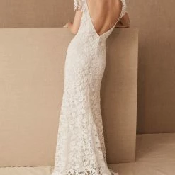 DESCRIPTION: This is a current Stella York style. Taking traditional bridal beauty into the modern age, this stunner from Stella York is bringing classic back—literally. An elegant V-neckline starts off this ultra-feminine silhouette, complete with sheer lace straps and a beaded floating strap detail in the back for a totally modern twist. The use of negative space throughout the gown really adds to the dimension and figure-flattering element of this gown, with the careful hand-placement of the laces sculpting the body for an enviable figure. Sheer side cutouts are masked with ivory tulle for the perfect amount of coverage with a subtle hint of sexy, complemented perfectly by the lace trim finish along the train.