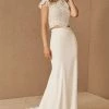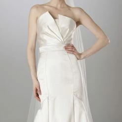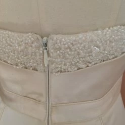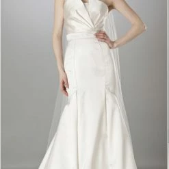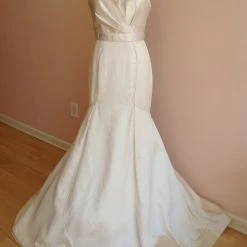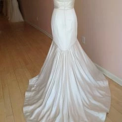 Ivory satin mermaid gown designed by Theia. The top has a unique modern origami inspired shape with white beading. The white beading gives the sharp lines an extra dramatic and unexpected touch. Beautifully tailored lines down the skirt. Dramatic train with pleating. The waistband adds a great touch to accentuate bride’s shape. Could add a beaded belt over top if one wanted to.