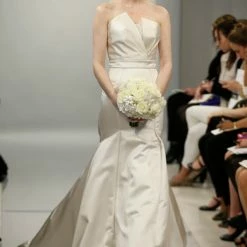 Captivate your man’s heart on your wedding day and beyond in 890067 by Theia Bridal. This fit and flare wedding gown features a fitted bodice with a strapless neckline and a mid cut back. The sweep train adds drama to the design. You’ll walk done the aisle with a classic and modern wedding day look.