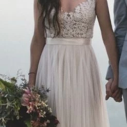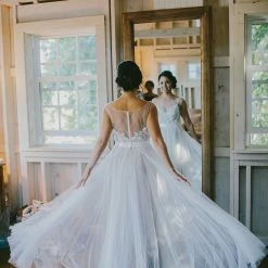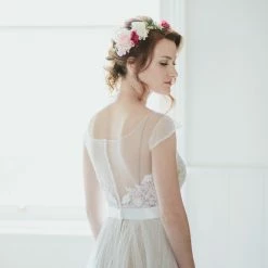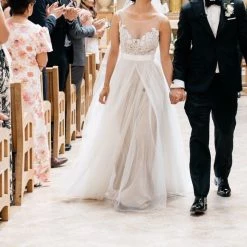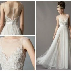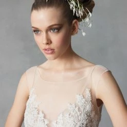 The Watters Jacinda comes with a hand-beaded soft netting and a stretch silk charmeuse slip dress. Bateau Italian illusion net neckline with pearl buttons and loops to top of waist. Double faced satin waistband covered with netting at natural waist. Soft netting paneled skirt with stretch silk charmeuse slip dress underneath. The slip dress underneath comes in amaretto.