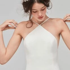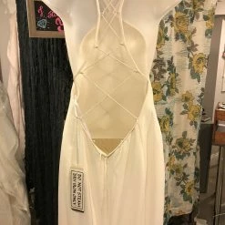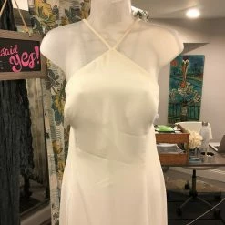 Such a simple and sleek bridal look. Open back and clean front! Spaghetti straps lead from the inverted V-neckline and interlace over the open back. There’s a chapel train and the dress is georgette style over a stretch charmeuse lining. This gown features a gorgeous shape and fabulous ivory georgette material. Unique corset style back. The strings could be changed around if you like. Fully lined.