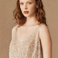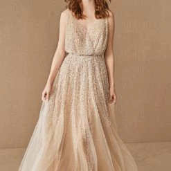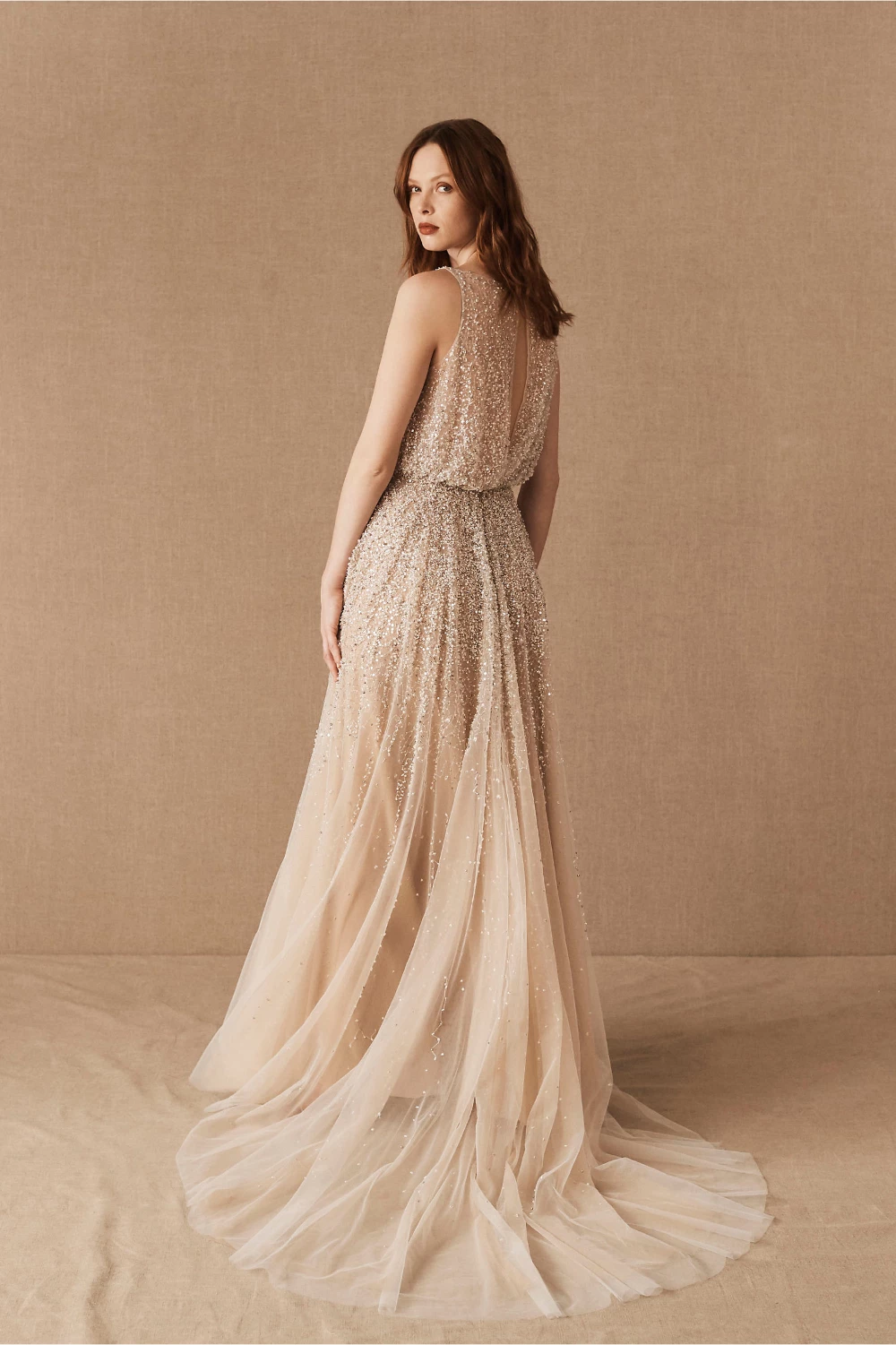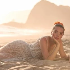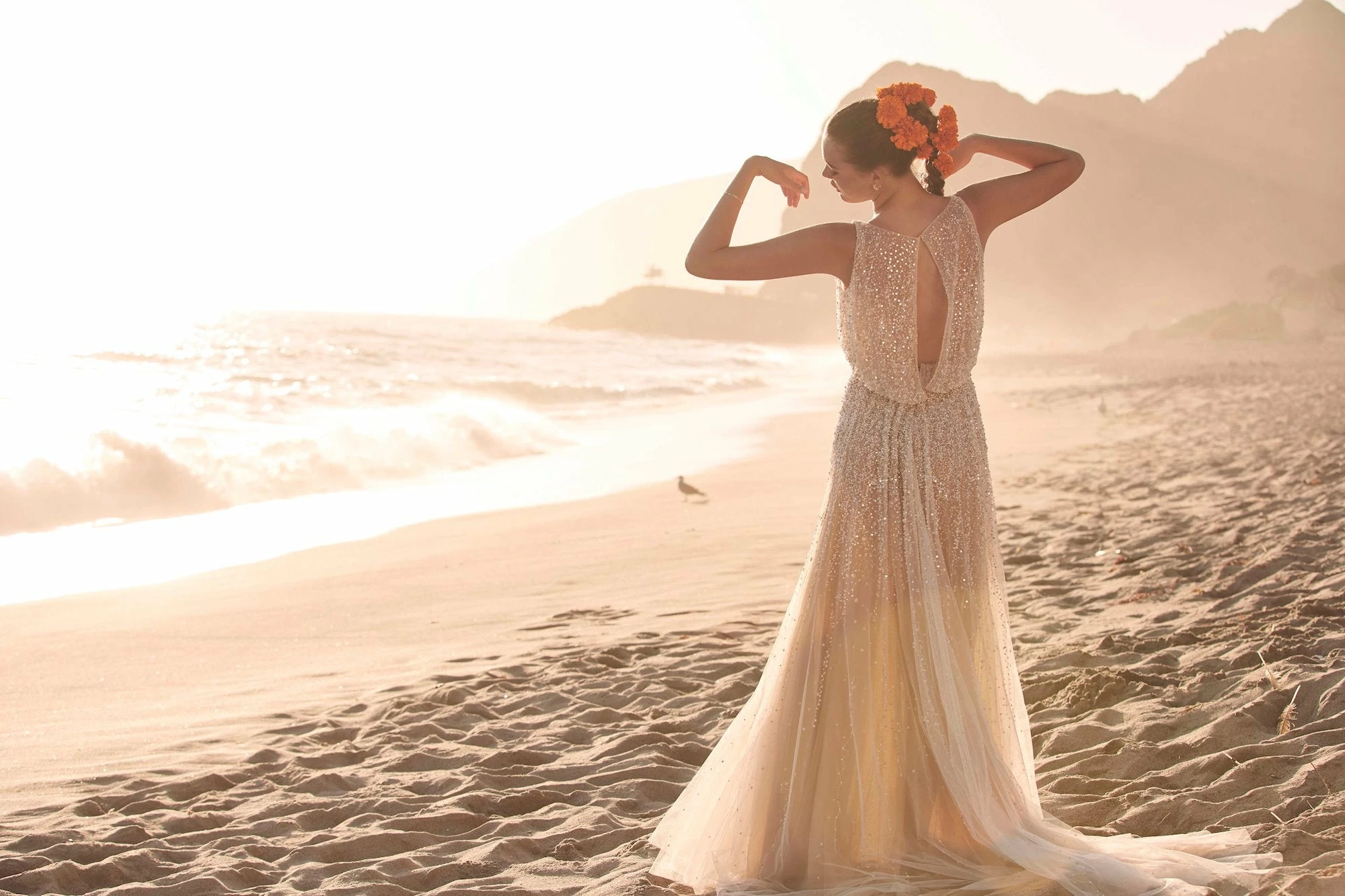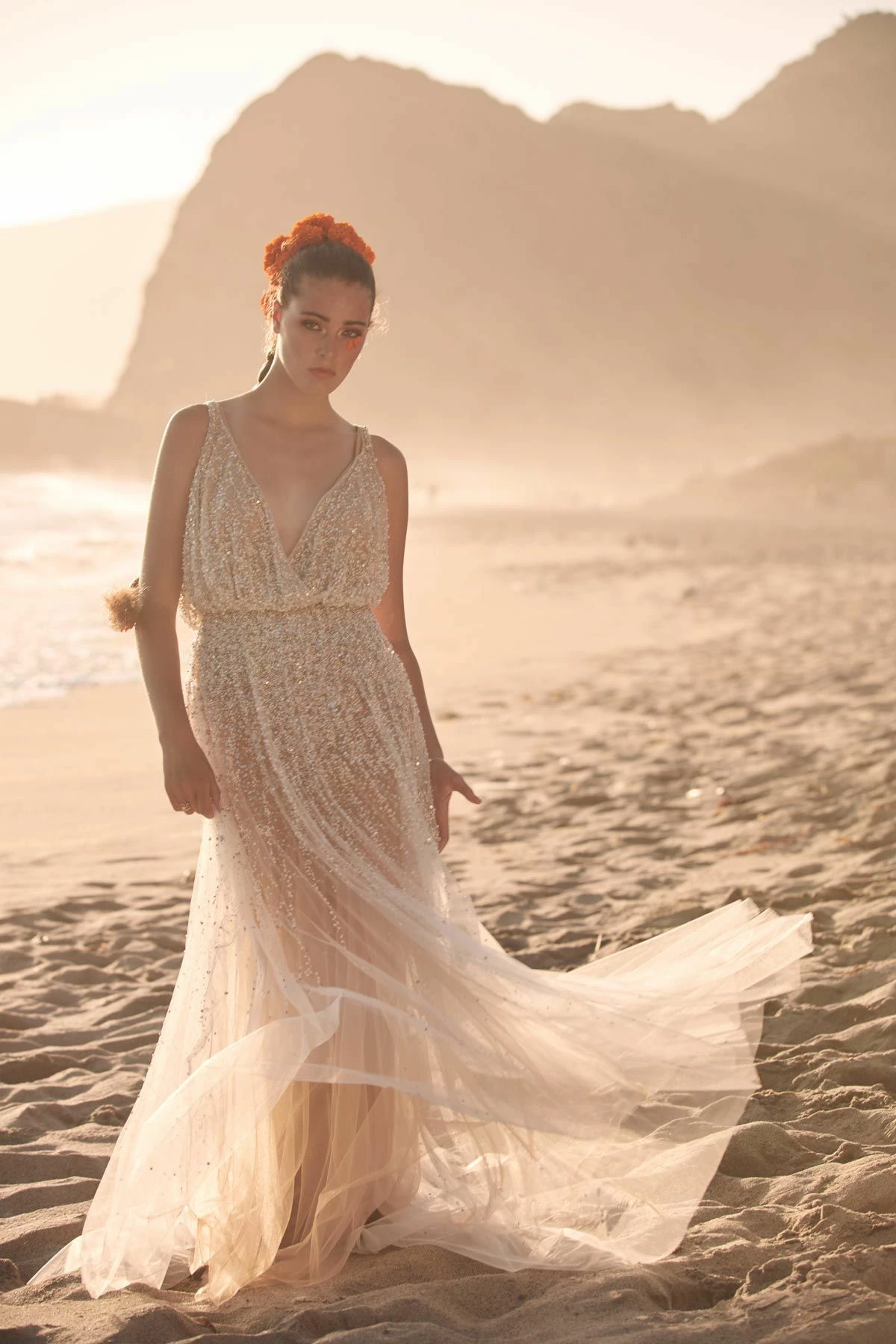 If you’re searching for a boho showstopper, this is the gown for you. A blouson top and wispy skirt bedecked in sparkles, sequins, and glitter make this the ideal choice for the bride craving bohemian glamour in a fit-and-flare silhouette. This gown’s v-neck blouson bodice and custom, light-catching beading has a way of bringing out your inner goddess. By Willowby by Watters.