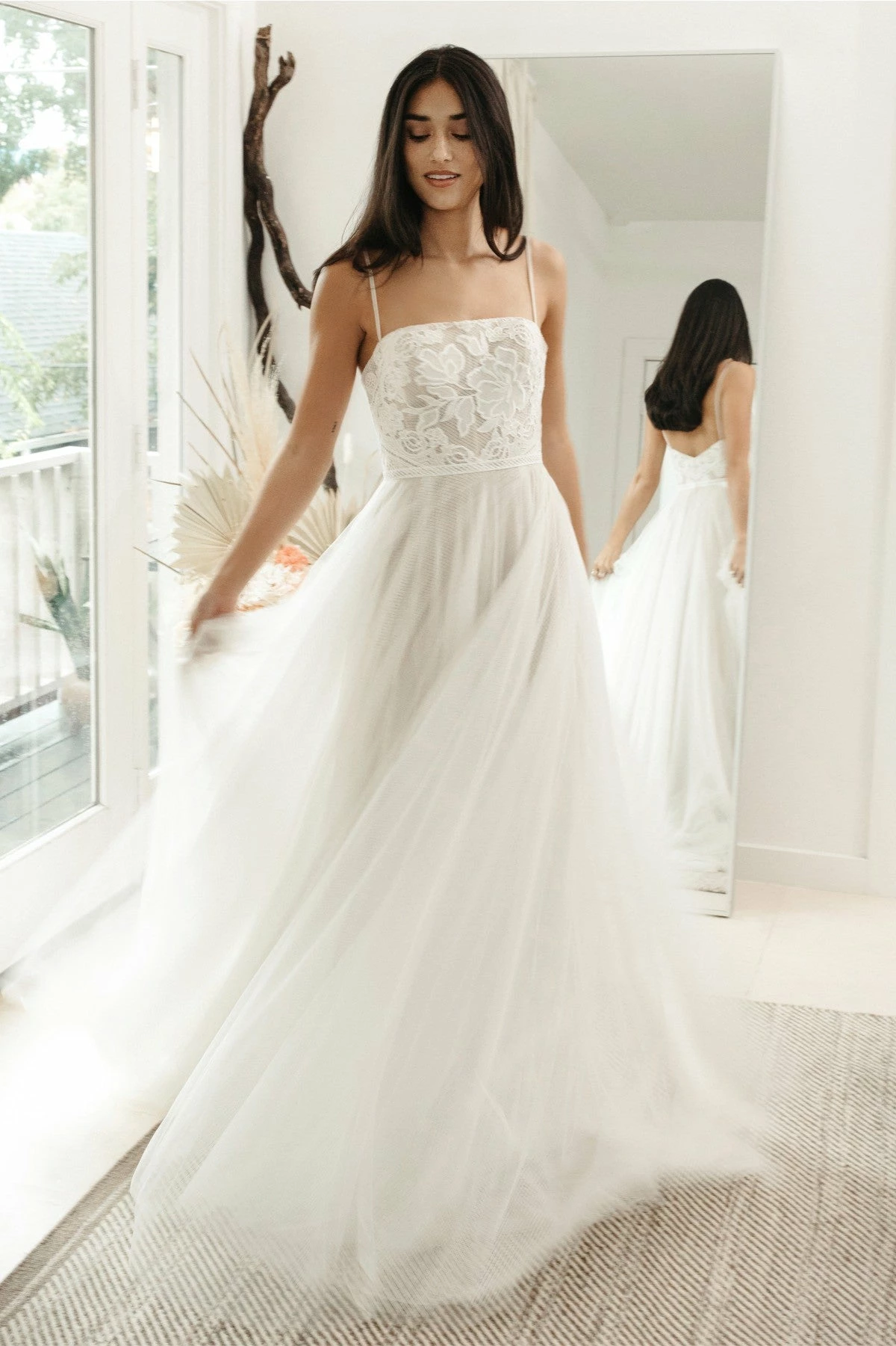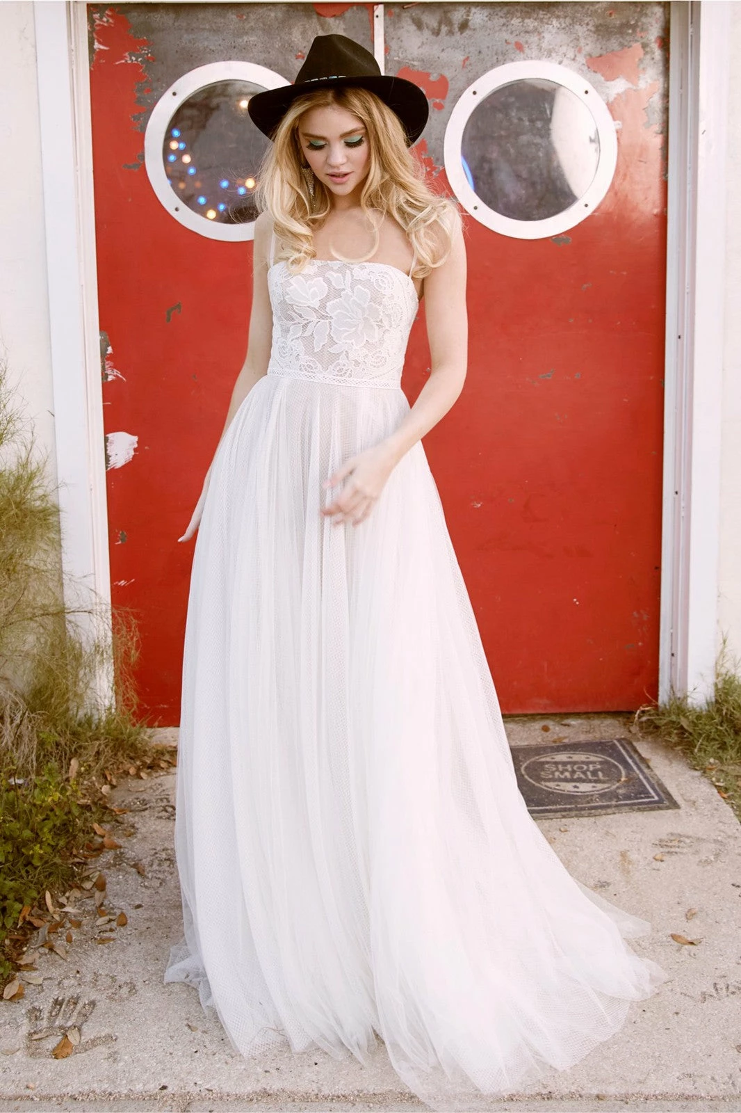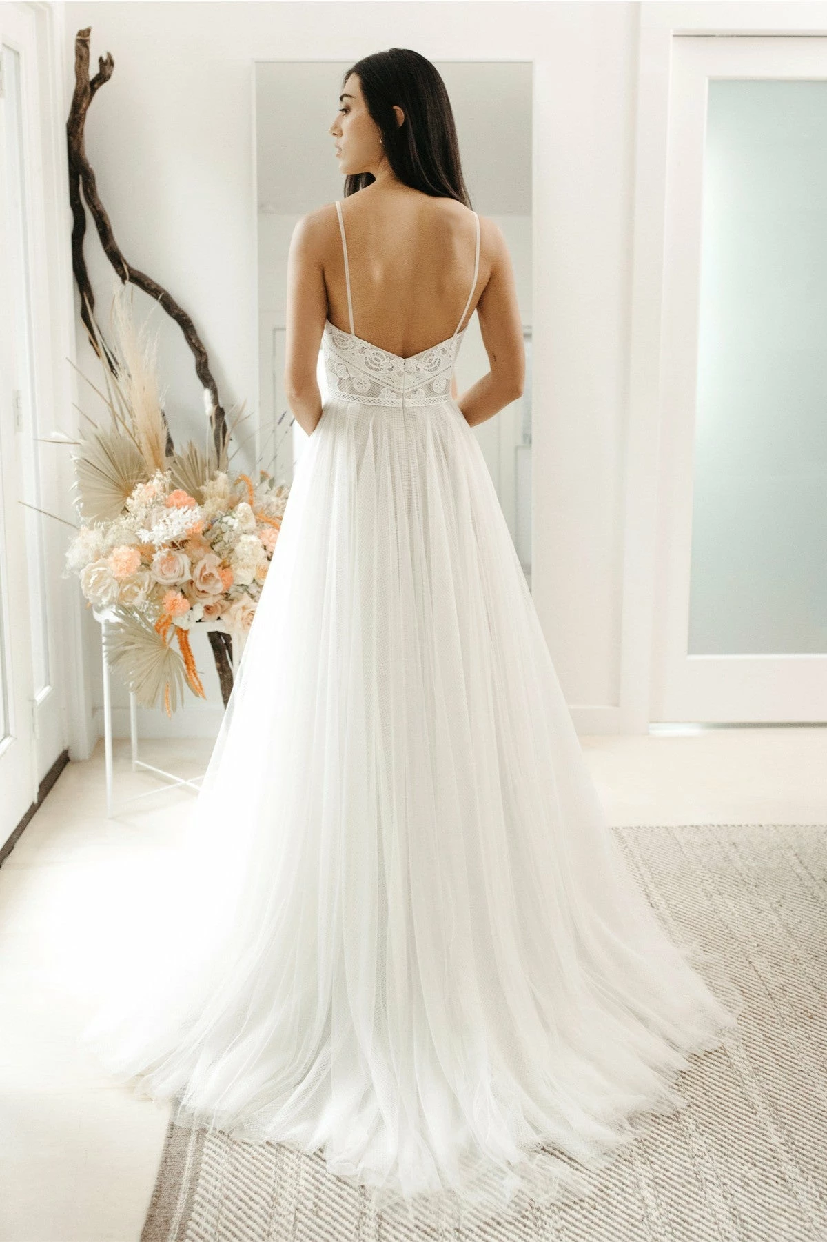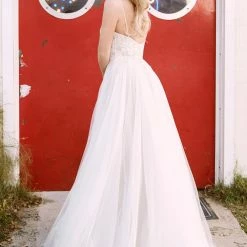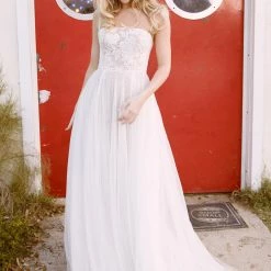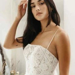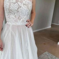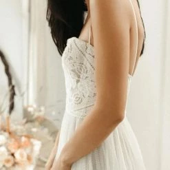 Willowby by Watters Hazel is an ethereal A-line gown. This beauty showcases a horizontal neckline and dainty straps that lead into a wide V back, as well as an airy skirt of netting. Lace on the bodice features beautiful floral embroidery filled with chiffon to create a stained glass window effect! Color:Â Ivory with Bronze undertone.Â
