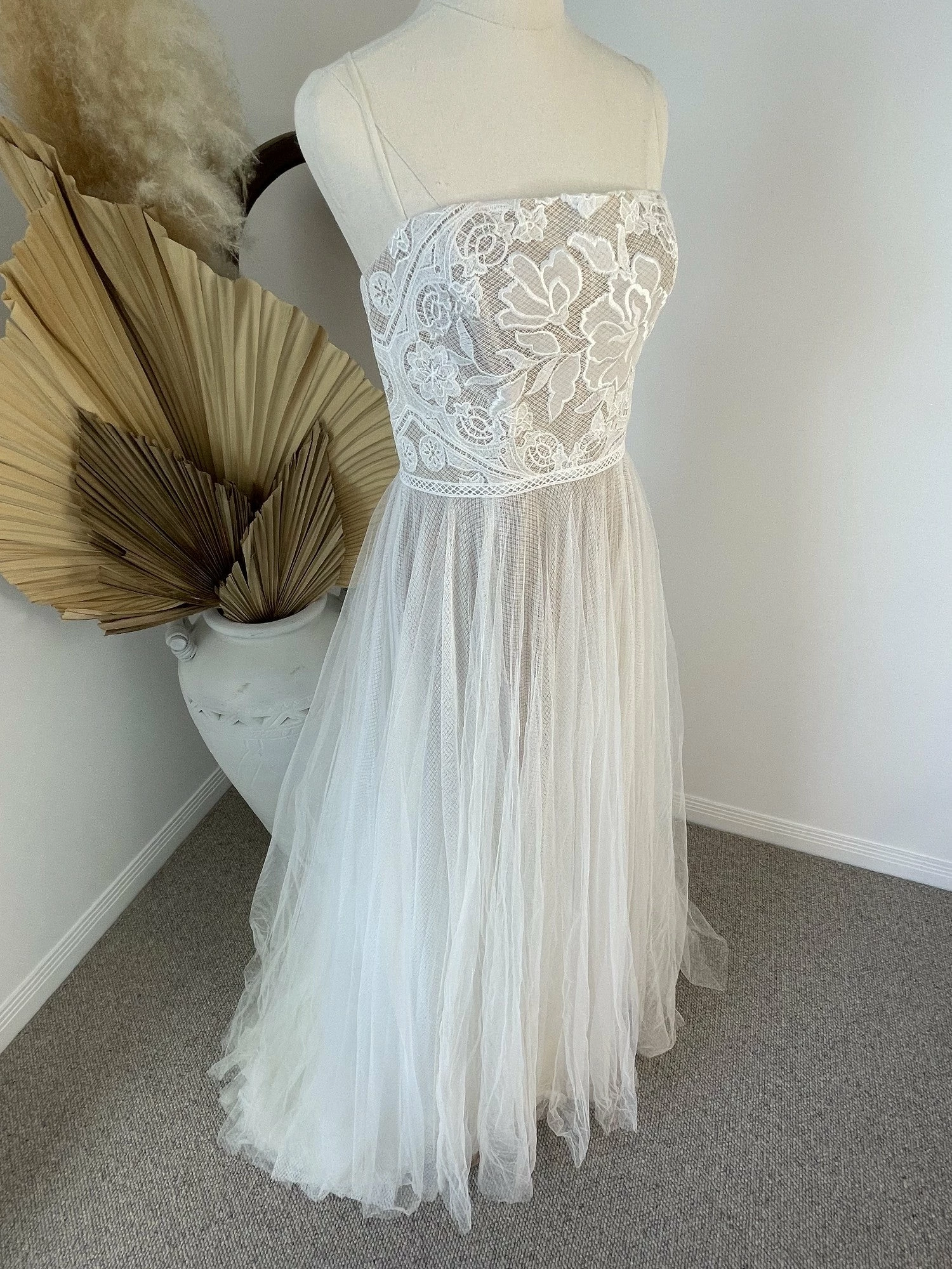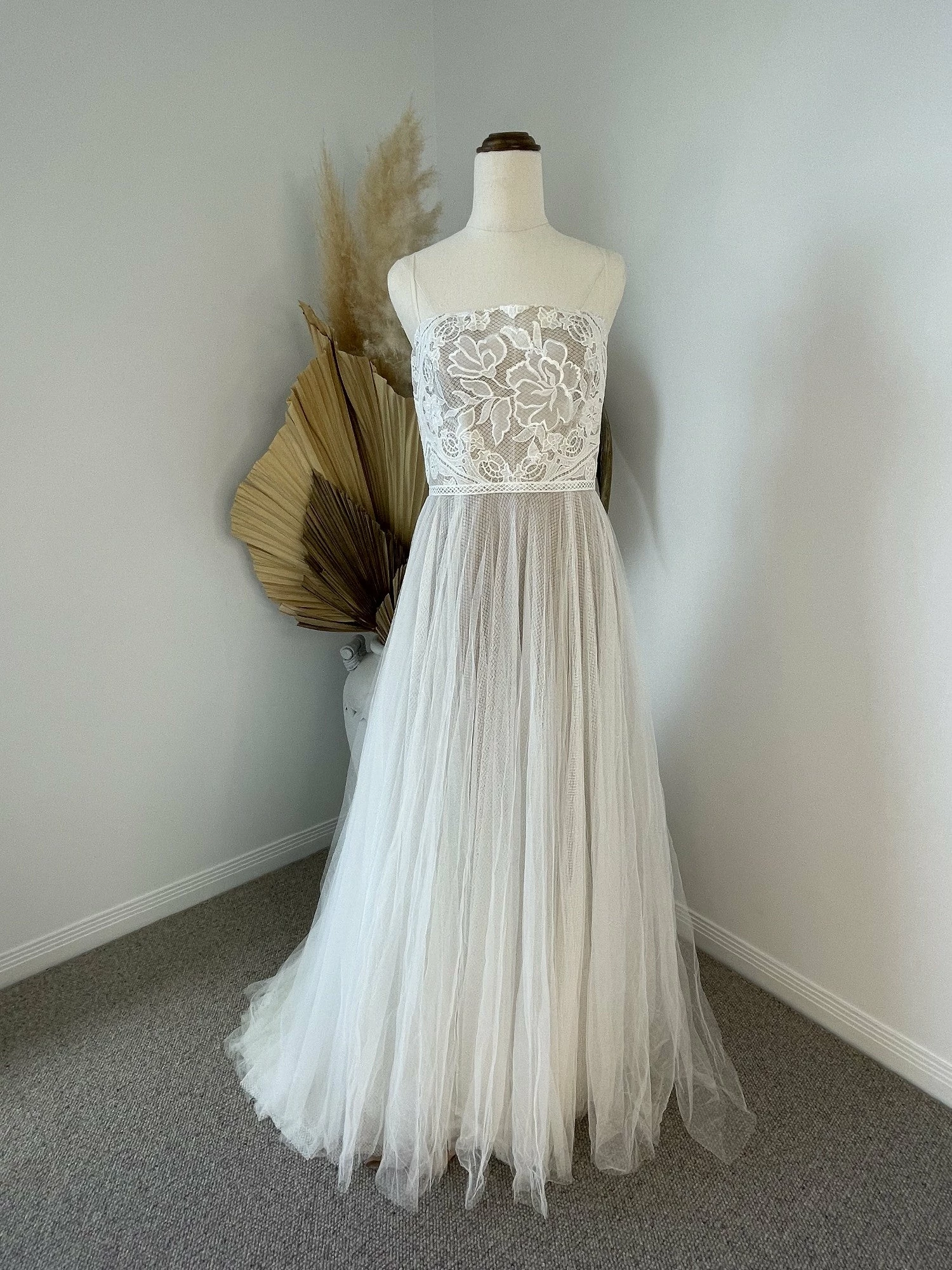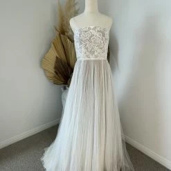 Size 8. This gown has been tried on in store. There is a small hole on the outer later of the tulle netting near the zipper. Presumably the tulle got caught in the zipper and created the hole. It’s not noticeable when worn due to the flowy nature of how the tulle falls. However, a seamstress can repair it with clear thread so it doesn’t get caught again. Otherwise the gown appears to be in link-new condition. Retail price: $1,689.