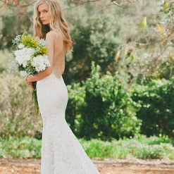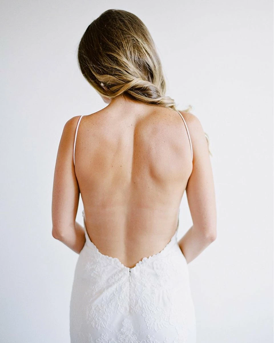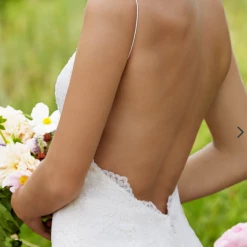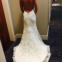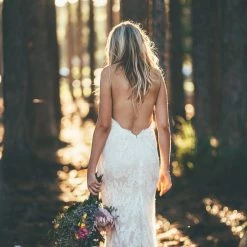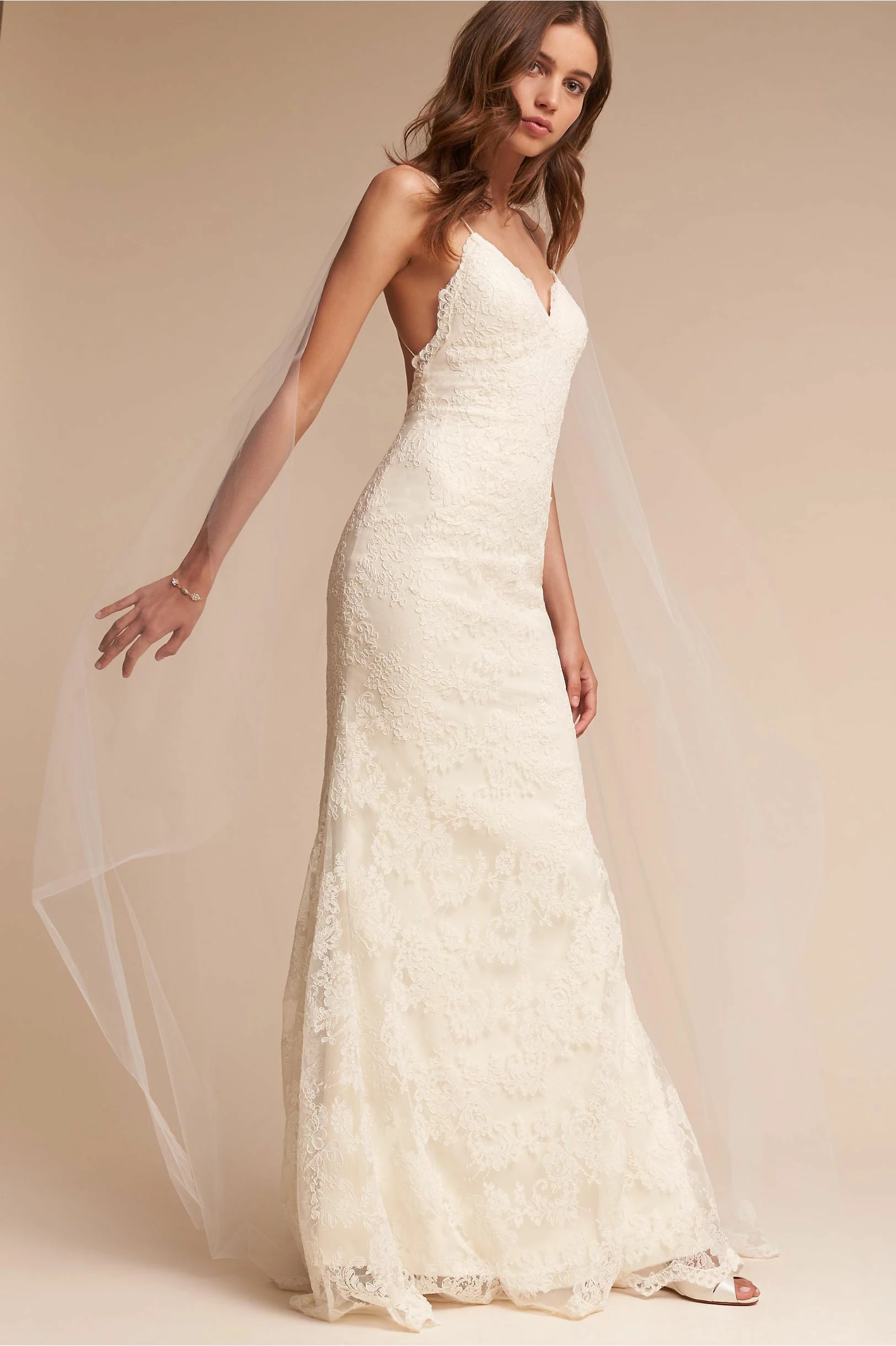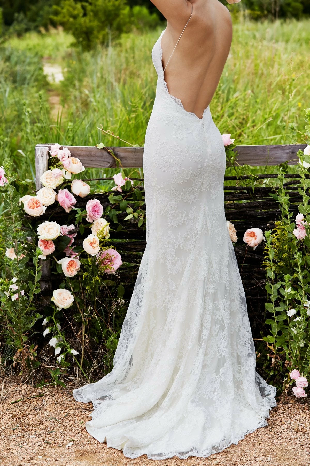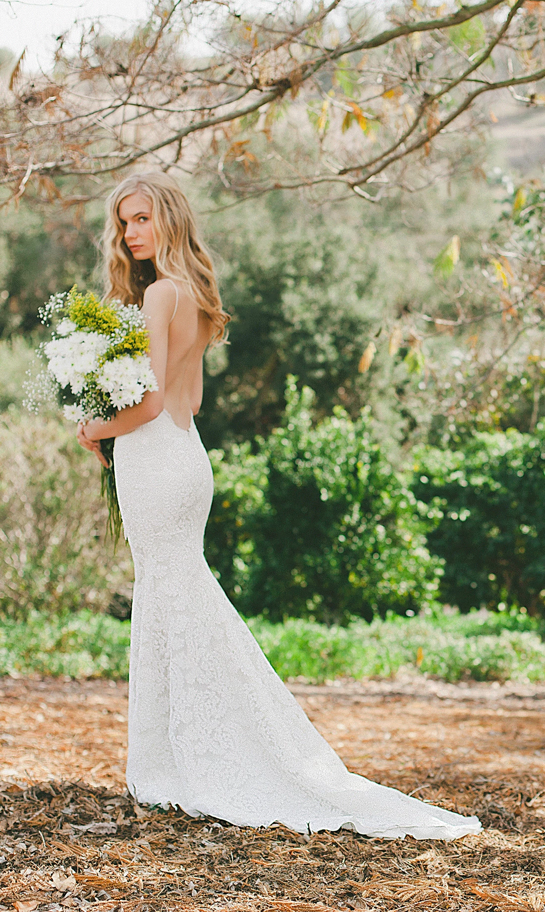 Covered entirely in delicate lace appliqué, this slim gown has a softly flared skirt, plunging back with scalloped detailing, and thin spaghetti straps; a chapel train leaves a lasting final impression. It’s a gorgeous option for the bohemian bride in search of a more modern look – it has a ‘bare’ feeling we love.