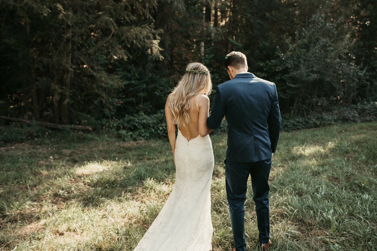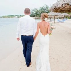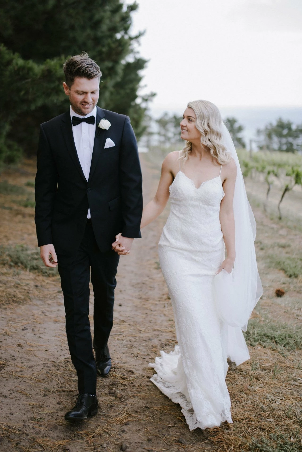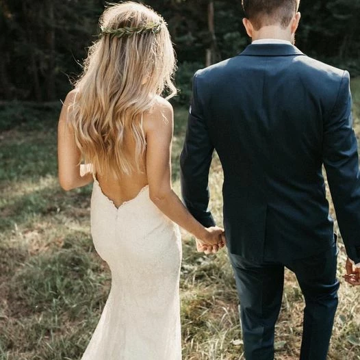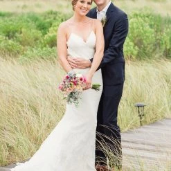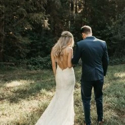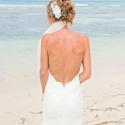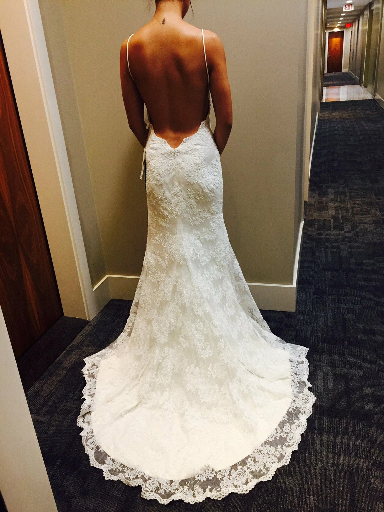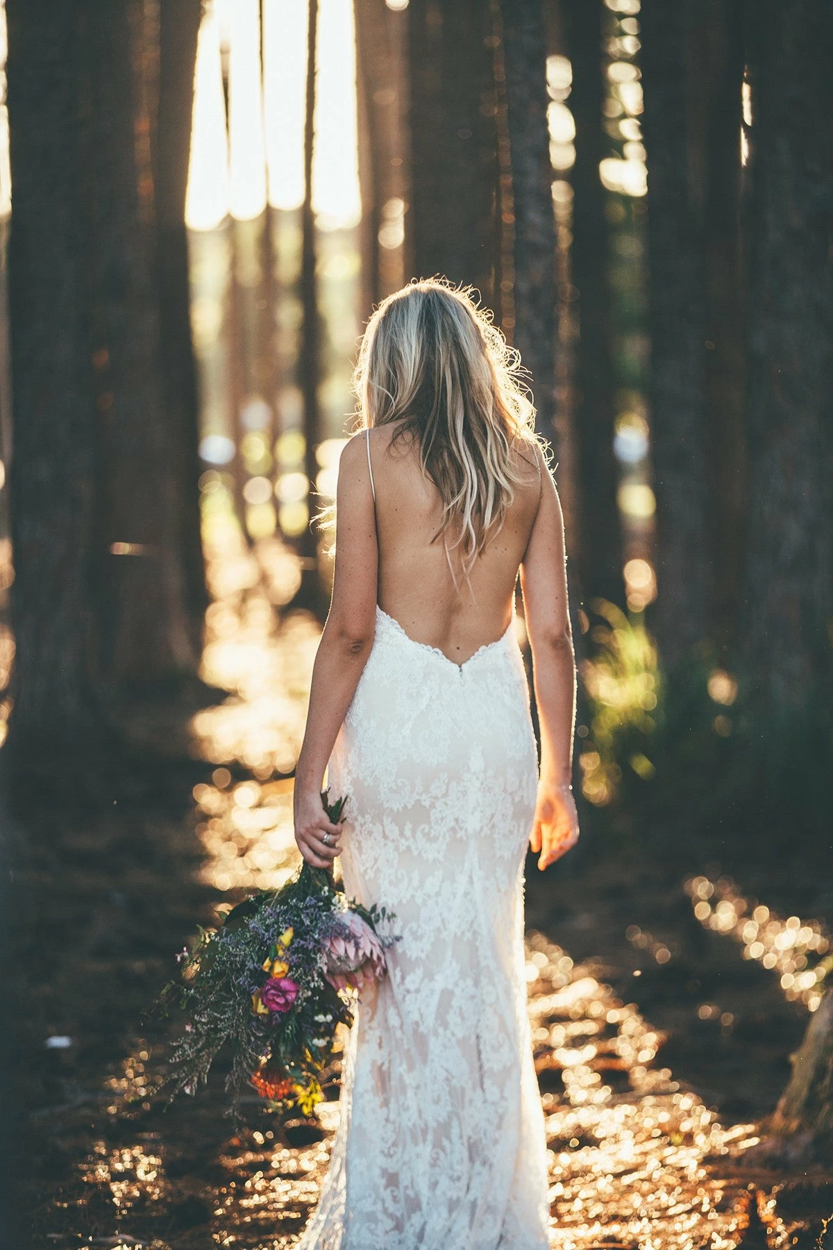 Covered entirely in delicate lace appliqué, this slim gown has a softly flared skirt, plunging back with scalloped detailing, and thin spaghetti straps; a chapel train leaves a lasting final impression. It’s a gorgeous option for the bohemian bride in search of a more modern look – it has a ‘bare’ feeling we love.