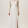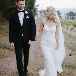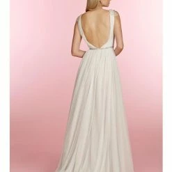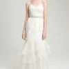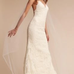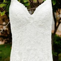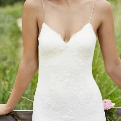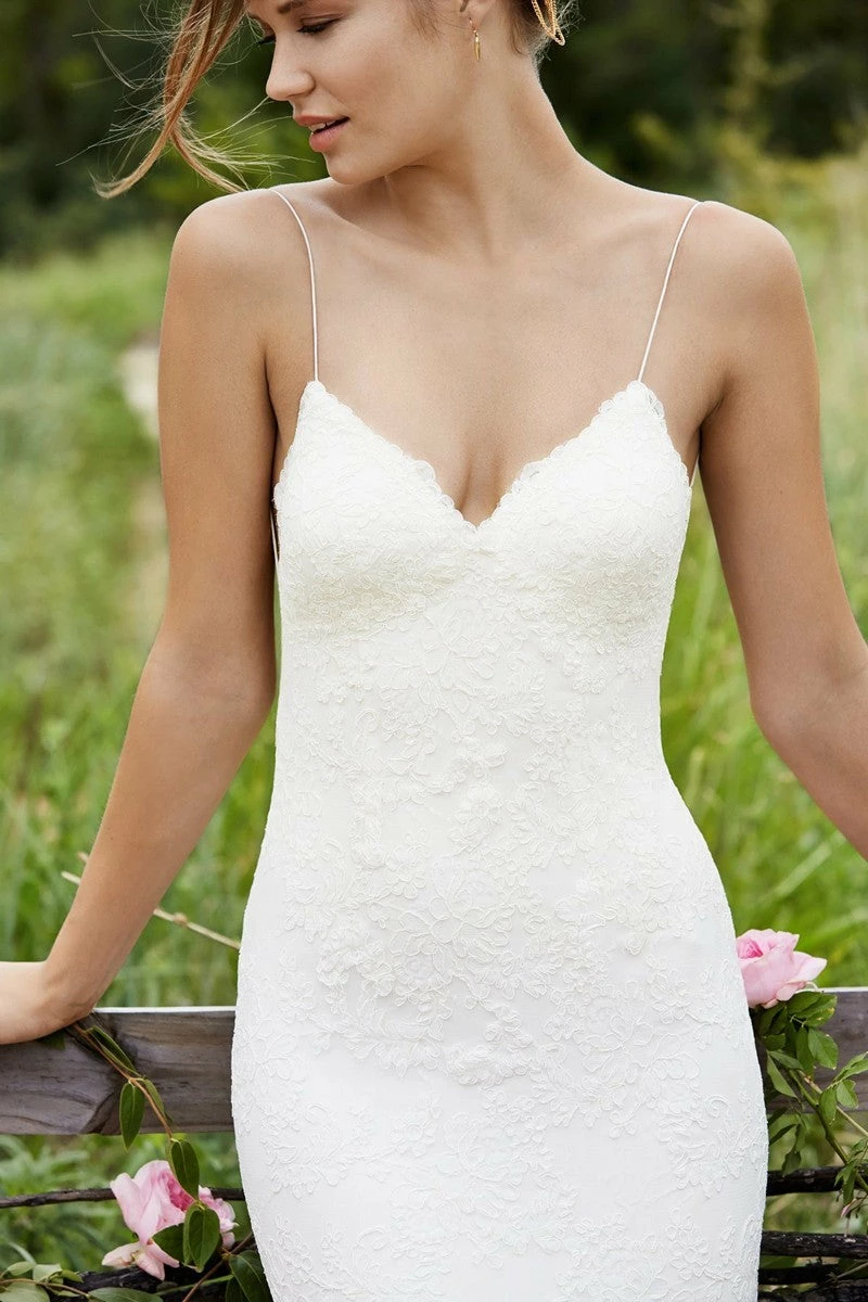 Exuding understated elegance, this slim fit-and-flare gown in re-embroidered lace has thin spaghetti straps and a plunging low back with scalloped lace detail. It’s lined in Stretch Satin for a smooth fit. Sweep train.