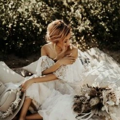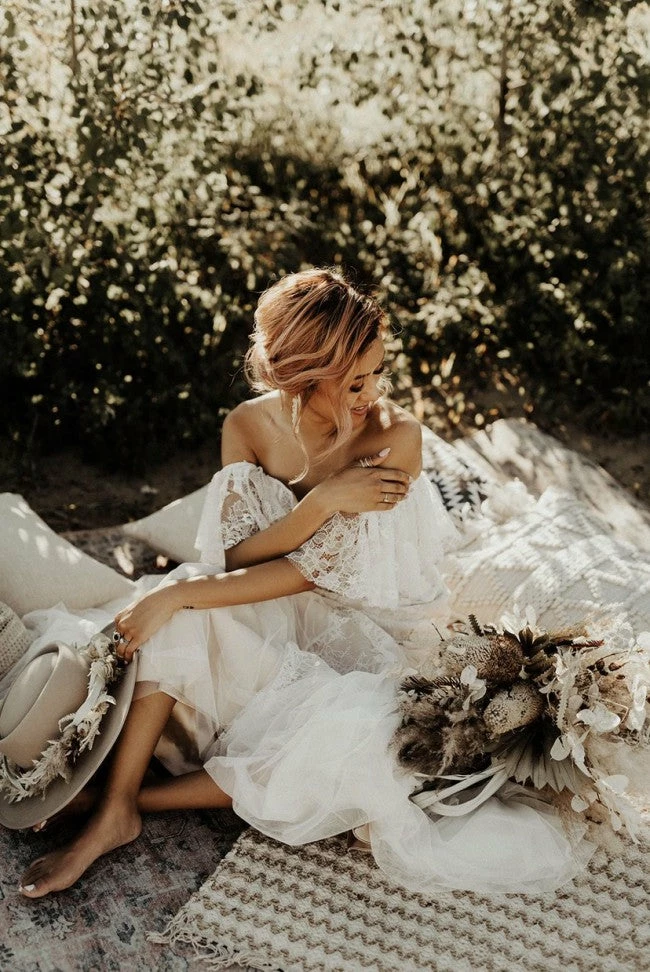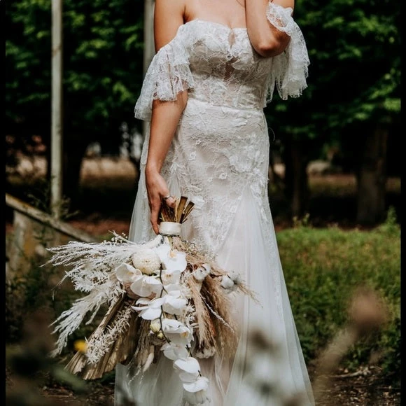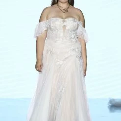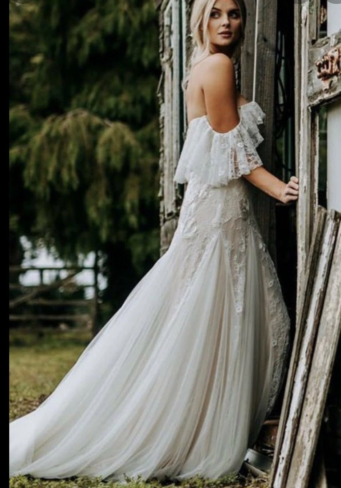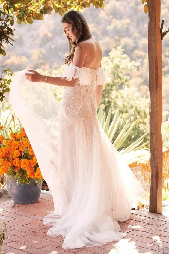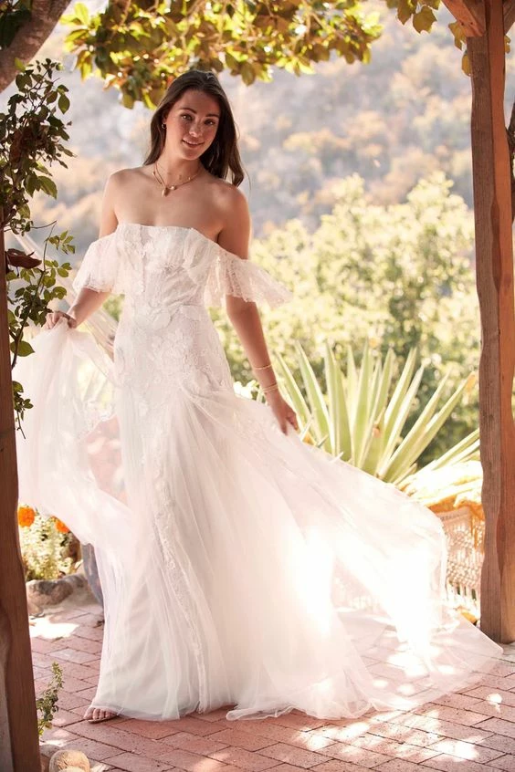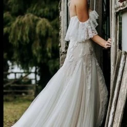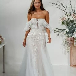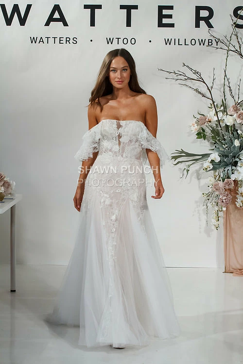 Willowby by Watters Mackinnon is an ethereal lace gown featuring the dreamiest tulle details! Fluttery off the shoulder sleeves accent the neckline, creating an eye-catching detail. The airy skirt completes the look!