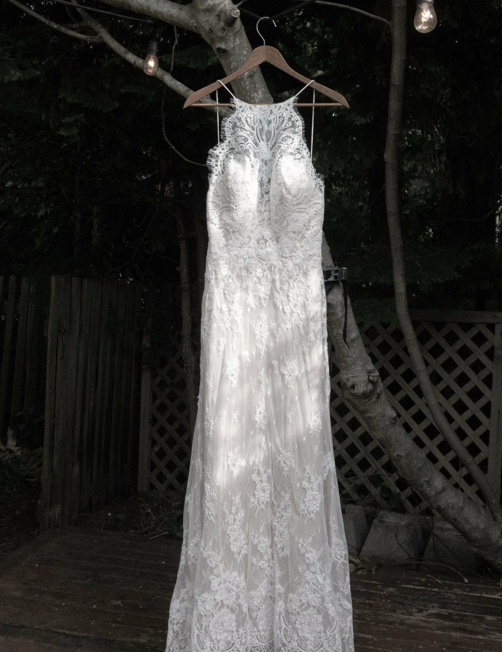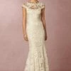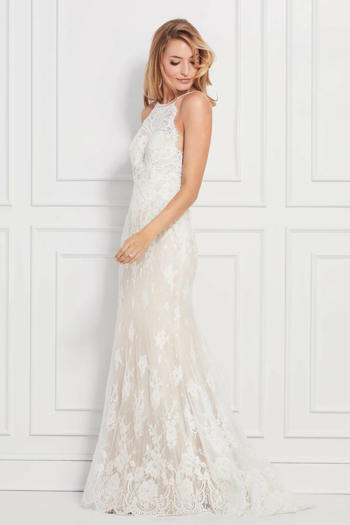 You only get one chance to make a grand entrance, so a dress of head-to-toe corded Alencon Lace with a plunging back pretty much covers it, we think.  By Wtoo by Watters. Color: Ivory.